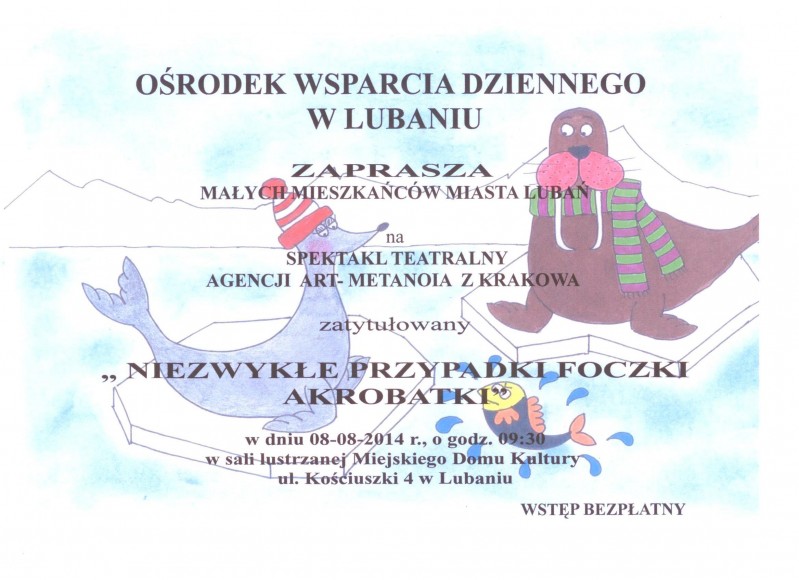 Ośrodek Wsparcia Dziennego w Lubaniu, zaprasza małych mieszkańców miasta Lubań na spektakl teatralny zatytułowany „Niezwykłe przypadki foczki akrobatki”, który odbędzie się w dniu 08-08-2014r., o godz. 09:30 w sali lustrzanej Miejskiego Domu Kultury ul. Kościuszki 4 w Lubaniu. WSTĘP BEZPŁATNY