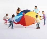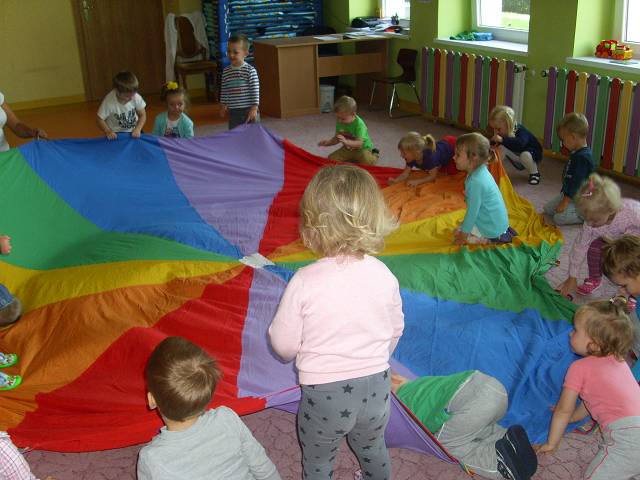 Celem tych zabaw jest integracja grupy. Ułatwiają one wzajemne poznanie dzieci, ćwiczą współdziałanie, zachęcają do nawiązywania kontaktów i współpracy, ćwiczą refleks i spostrzegawczość wymagając skupienia uwagi. Rozwijają takie cechy charakteru, jak pewność siebie i wiarę we własne siły oraz odwagę. Wprowadzają odprężenie i relaks , a także wywołują dobry nastrój.W tak znakomitym nastroju są właśnie nasze maluchy bawiąc się chustą animacyjną.Dzieci uwielbiają trzymać chustę, kręcić się z nią, leżeć na niej, siedzieć w środku, podrzucać piłeczkę i usypiać misia. Największą frajdę sprawia dzieciom chowanie się pod chustą.