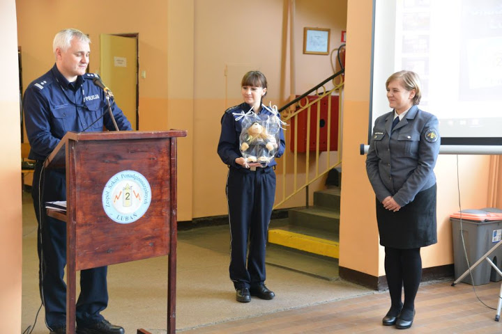 Po zakończeniu tej części uroczystości głos zabrał Komendant Policji mł. insp. mgr Artur Ciupa, podkreślający rolę innowacji pedagogicznej, podjętej przez klasy liceum w ZSP nr 2 oraz życząc, aby „przygoda z mundurem” nie zakończyła się z chwilą zdania matury. Słowa do młodzieży zakończył bardzo miłym gestem – wręczeniem nagrody dla najlepszej uczennicy klasy 3 LO, Magdaleny Hrebieńczuk