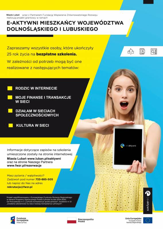 Informacje dotyczące zapisów na szkolenia dostępne na www.luban.pl/eaktywni na stronie partnera www.fwzr.pl/rezerwacje oraz w instytucjach realizujących szkolenia.