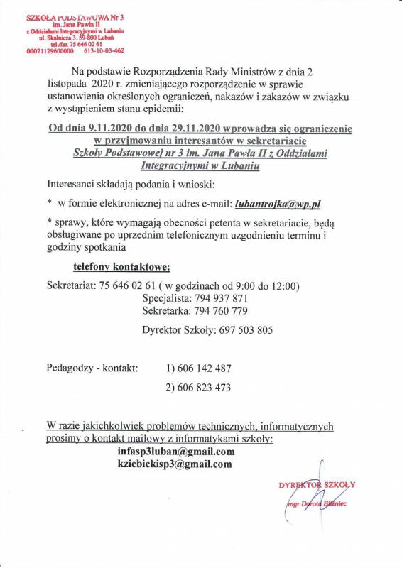 Ogłoszenie Dyrektora Szkoły Podstawowej Nr 3 im. Jana Pawła II z Oddziałami Integracyjnymi w Lubaniu.