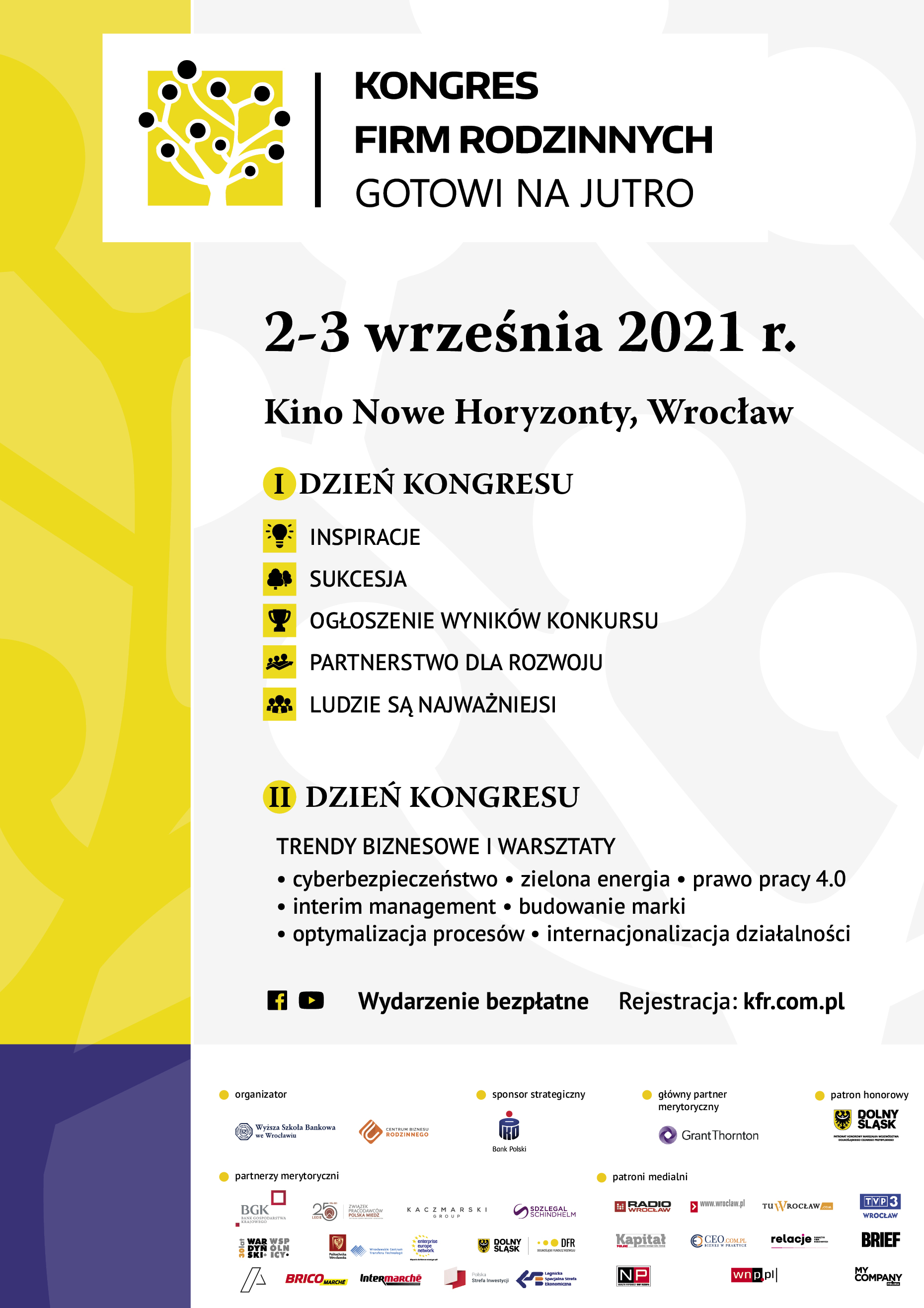 Kongres Firm Rodzinnych „Gotowi na jutro” odbędzie się 2-3 września br. w Kinie Nowe Horyzonty we Wrocławiu. Program wydarzenia, informacje o prelegentach oraz formularz zapisu na Kongres dostępne są na stronie www: kfr.com.pl (https://kfr.com.pl/).