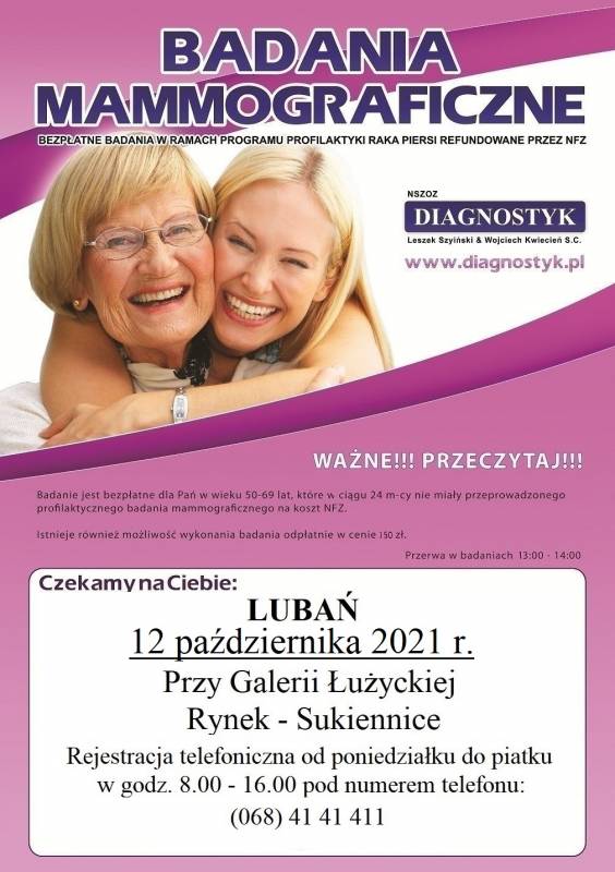 Dnia 12 października 2021 r. przy Galerii Łużyckiej przeprowadzane będą bezpłatne badania mammograficzne dla kobiet w wieku od 50 do 69 lat, które w ciągu ostatnich dwóch lat nie miały wykonywanych tego typu badań.