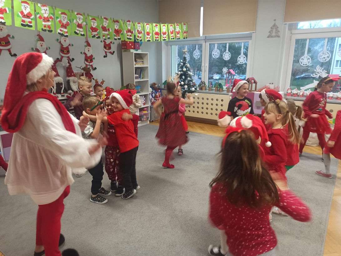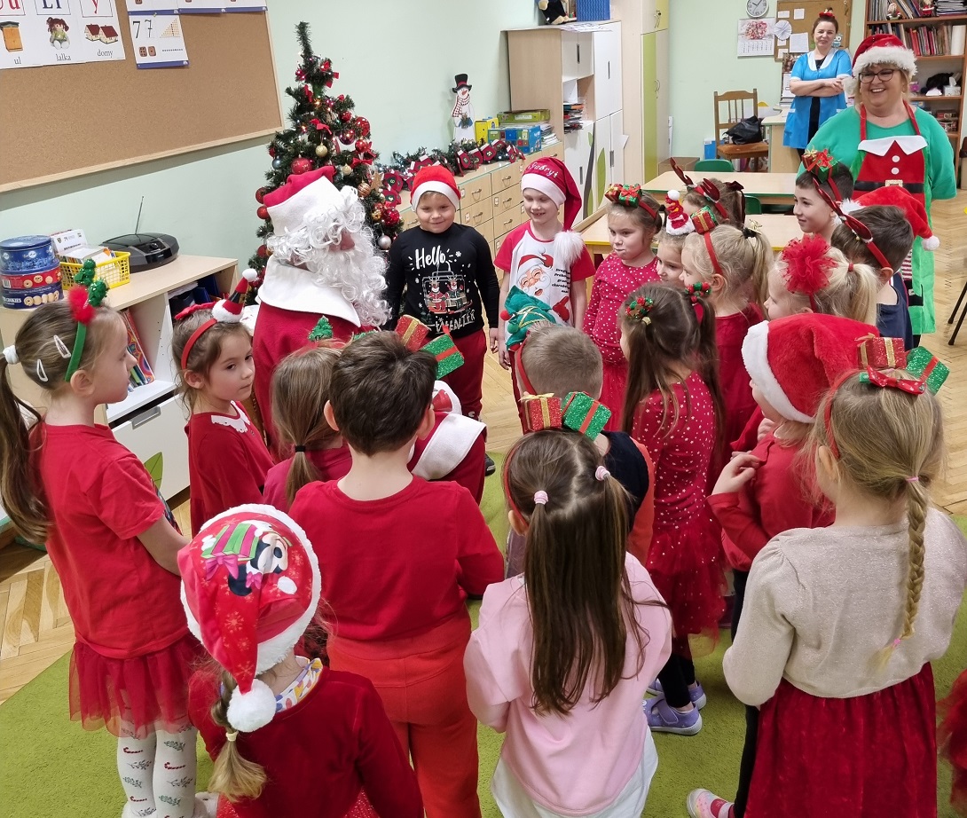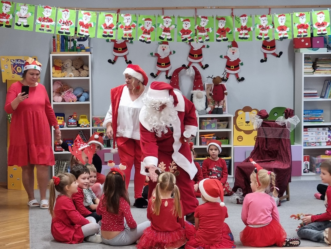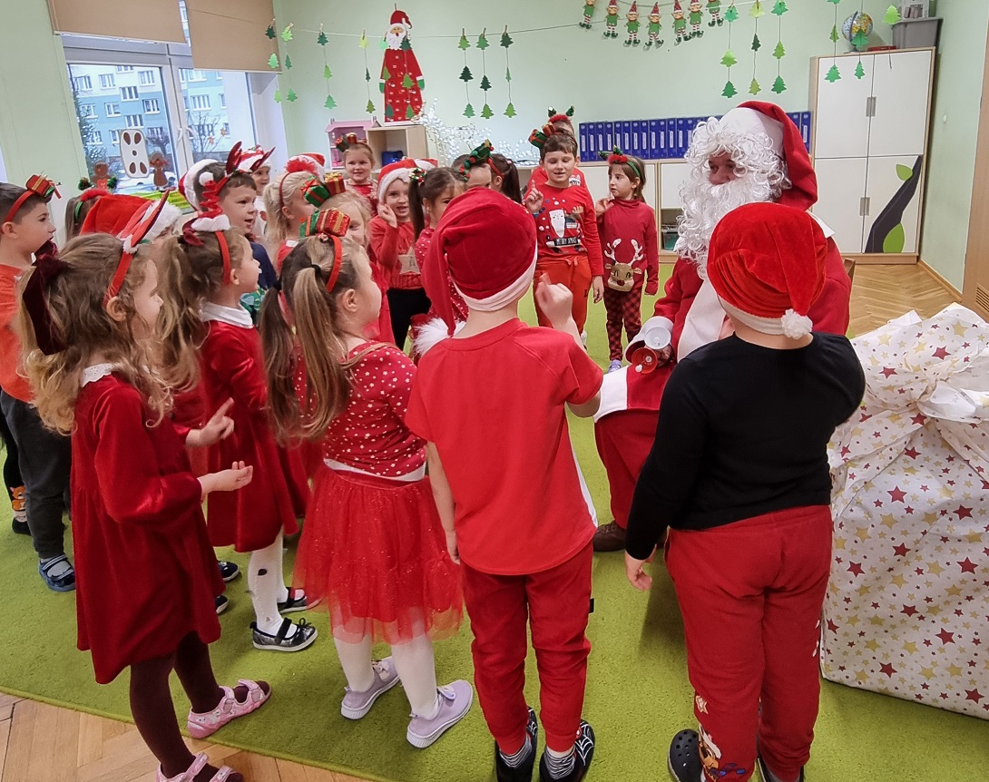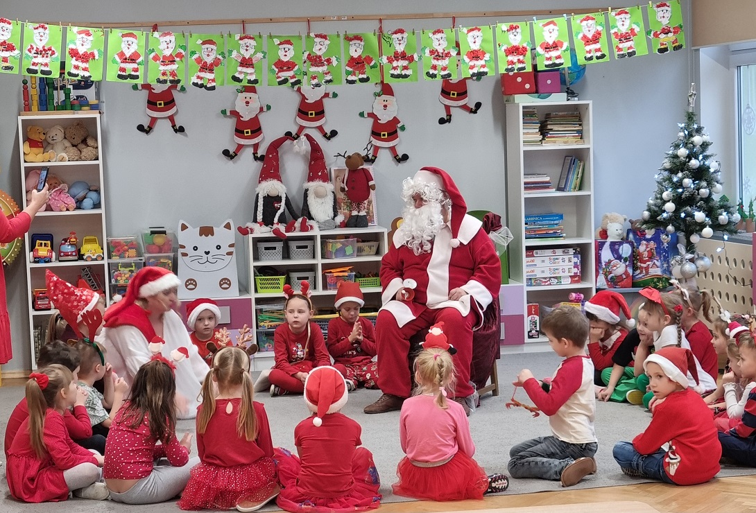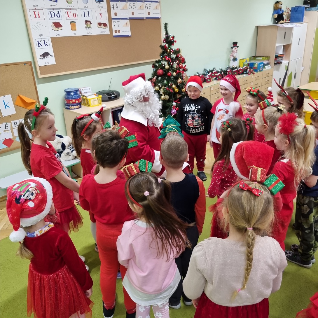 Chociaż nie było śniegu, jak co roku przybył na czas. Spotkanie przebiegało w radosnej atmosferze. Dzieci z grupy IV pod opieka pani Ani powitały niezwykłego gościai oprowadzały Mikołaja po przedszkolu. Wszystkie dzieci ubrały się na kolor czerwony, a głowy zdobiły mikołajowe czapki lub opaski świąteczne.Każda grupa przygotowała dla gościa muzyczną niespodziankę. Przedszkolaki starannie przygotowały się do wizyty Św. Mikołaja. W przedszkolu pisały lub rysowały listy, nauczyły się piosenek o Mikołaju, wykonywały prace plastyczne o tematyce świątecznej, ubierały choinkę, dekorowały salę, piekły pierniczki i wykonywały smakołyki cukierkowe.Na twarzach dzieci malował się uśmiech, przejęcie, a takze nadzieja na kolejne spotkanie. Św. Mikołaju bardzo dziękujemy za odwiedziny , podarki otrzymane od Ciebie bardzo nam podobają się. Dziękujemy za odwiedziny i do zobaczenia za rok...