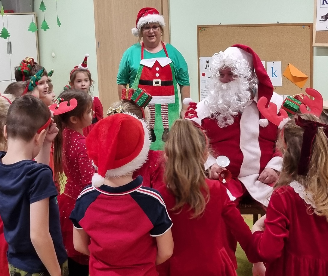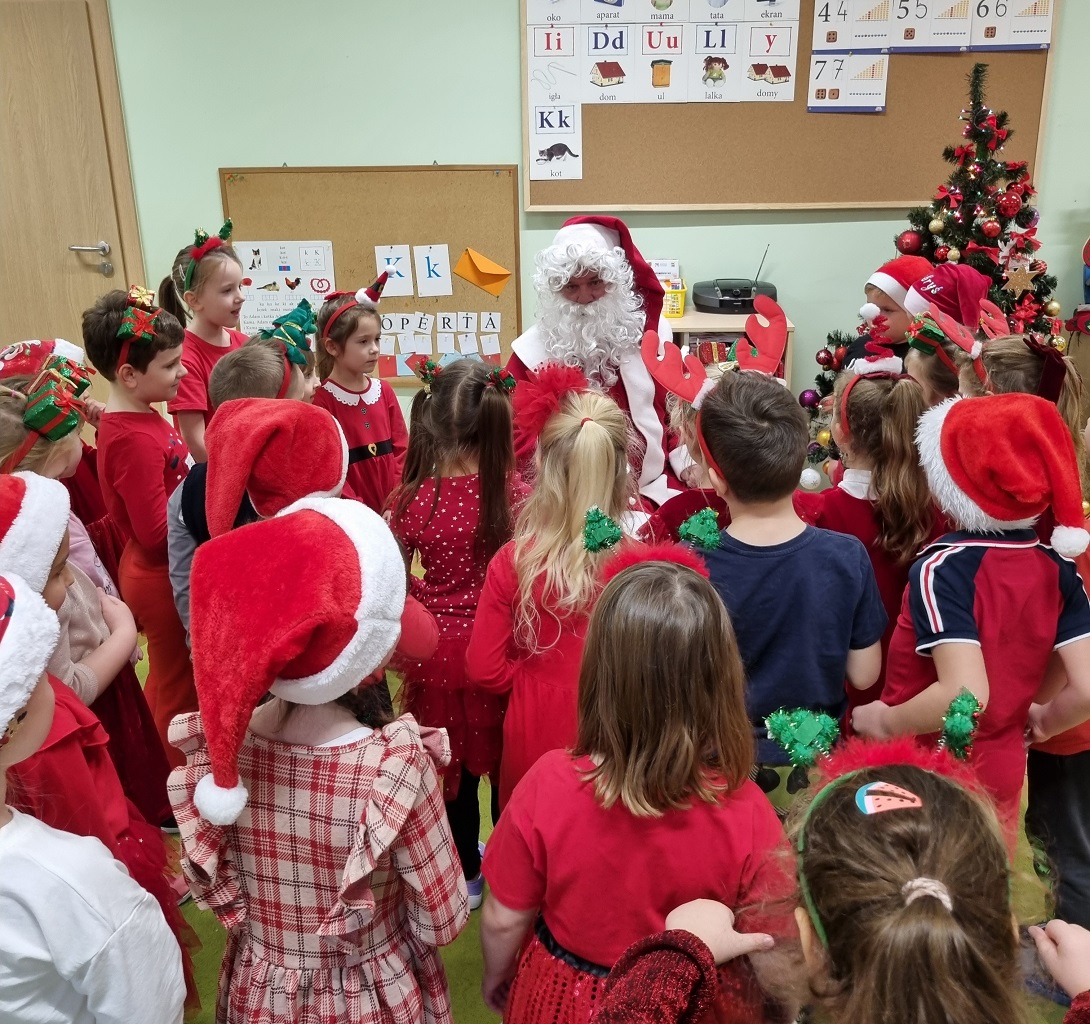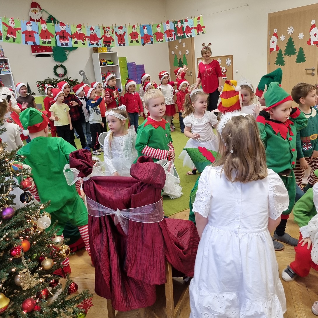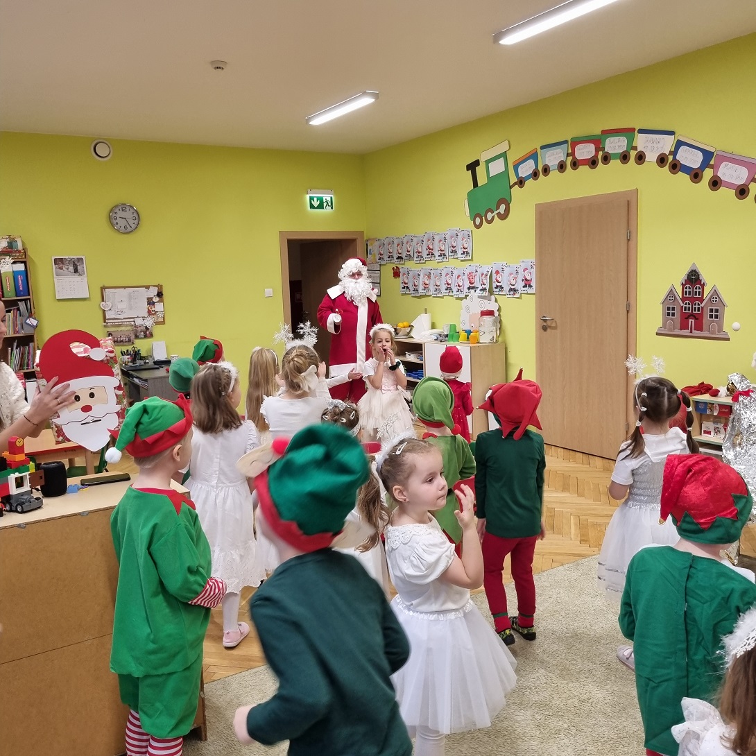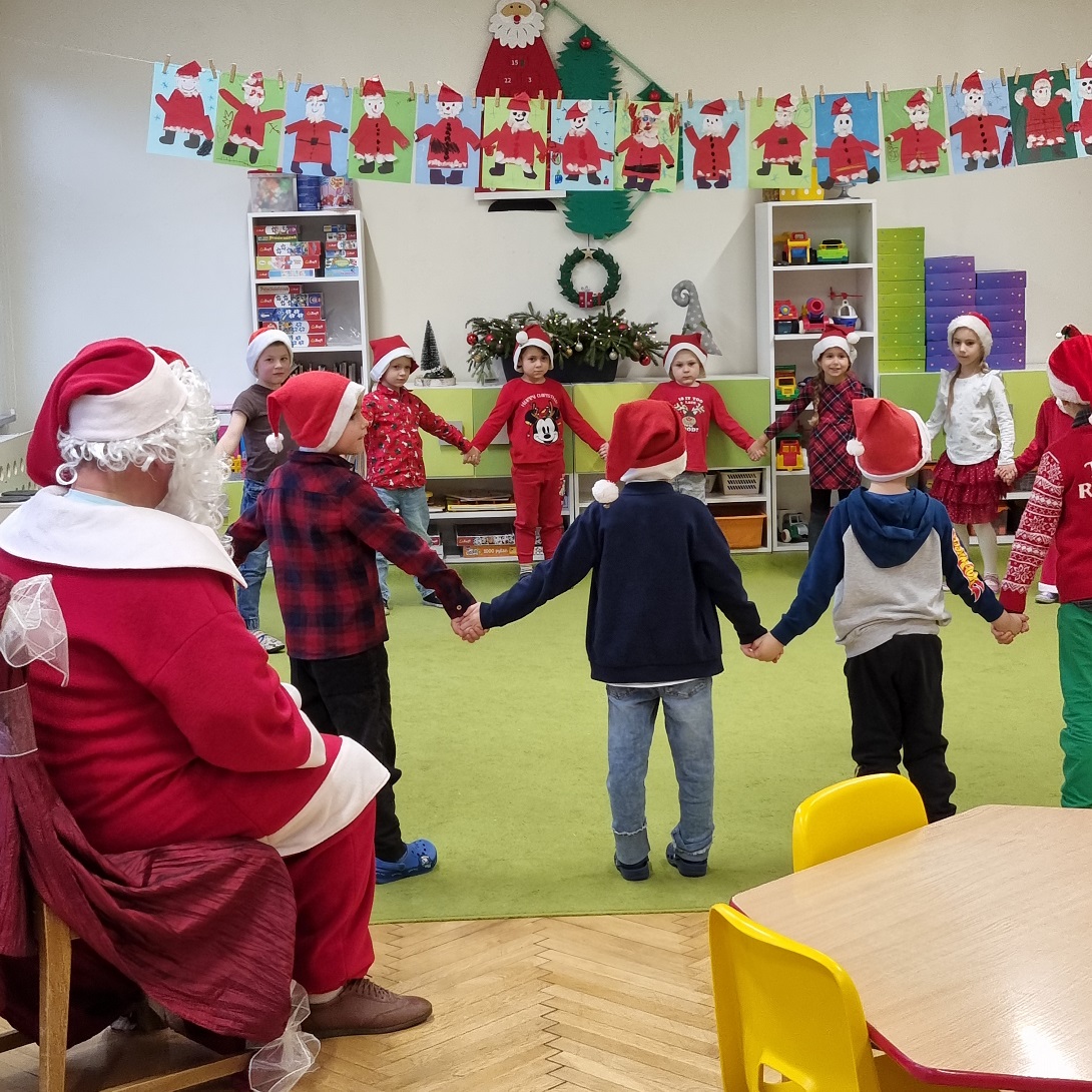 Chociaż nie było śniegu, jak co roku przybył na czas. Spotkanie przebiegało w radosnej atmosferze. Dzieci z grupy IV pod opieka pani Ani powitały niezwykłego gościai oprowadzały Mikołaja po przedszkolu. Wszystkie dzieci ubrały się na kolor czerwony, a głowy zdobiły mikołajowe czapki lub opaski świąteczne.Każda grupa przygotowała dla gościa muzyczną niespodziankę. Przedszkolaki starannie przygotowały się do wizyty Św. Mikołaja. W przedszkolu pisały lub rysowały listy, nauczyły się piosenek o Mikołaju, wykonywały prace plastyczne o tematyce świątecznej, ubierały choinkę, dekorowały salę, piekły pierniczki i wykonywały smakołyki cukierkowe.Na twarzach dzieci malował się uśmiech, przejęcie, a takze nadzieja na kolejne spotkanie. Św. Mikołaju bardzo dziękujemy za odwiedziny , podarki otrzymane od Ciebie bardzo nam podobają się. Dziękujemy za odwiedziny i do zobaczenia za rok...