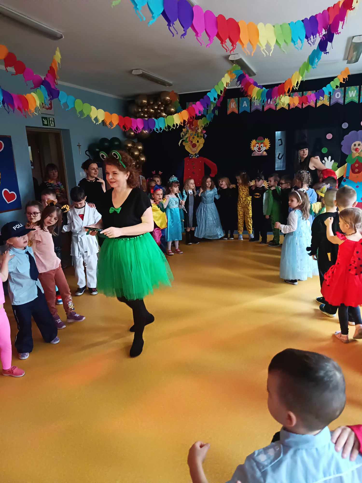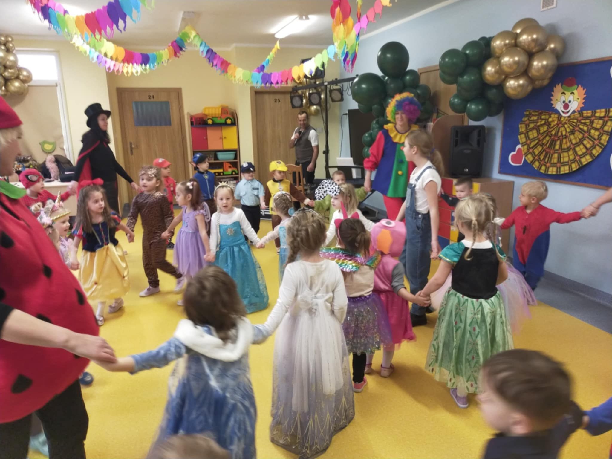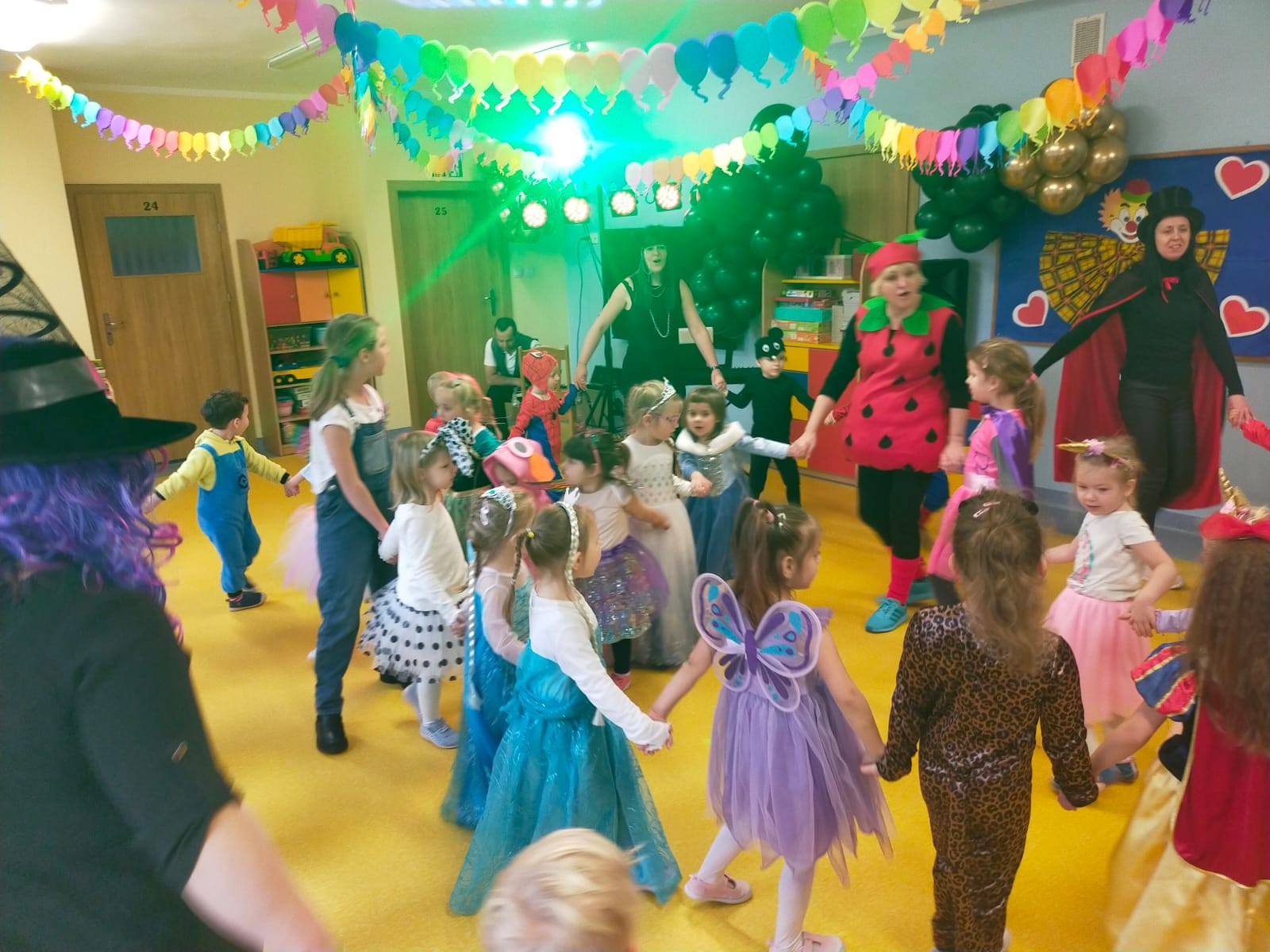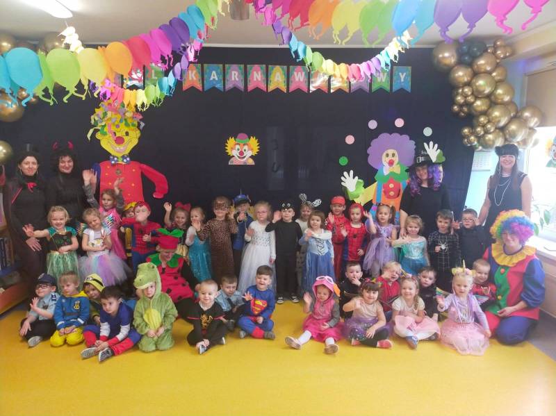 Całe wydarzenie odbyło się w radosnej atmosferze, wypełnionej tańcami, zabawami i konkursami prowadzonymi przez p. Marcina. Sala przedszkolna została pięknie udekorowana balonami, serpentynami i migoczącymi ozdobami, które wprowadzały prawdziwie karnawałowy nastrój. Wydarzenie dostarczyło dzieciom wiele uśmiechu i niezapomnianych wrażeń, a także było okazją do integracji i wspólnej zabawy.