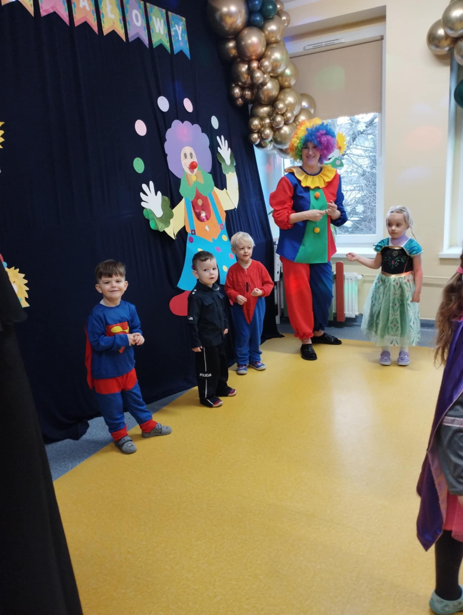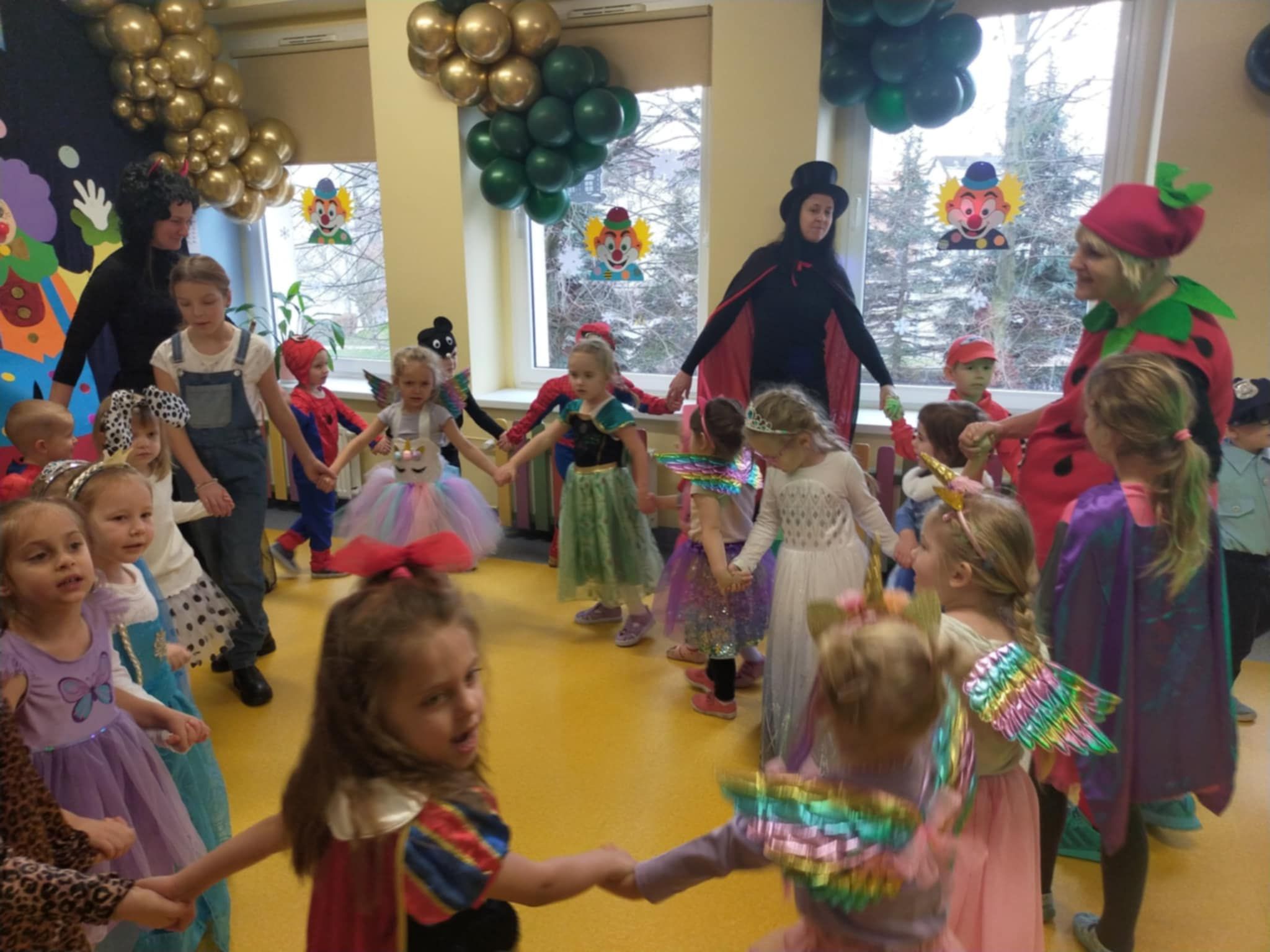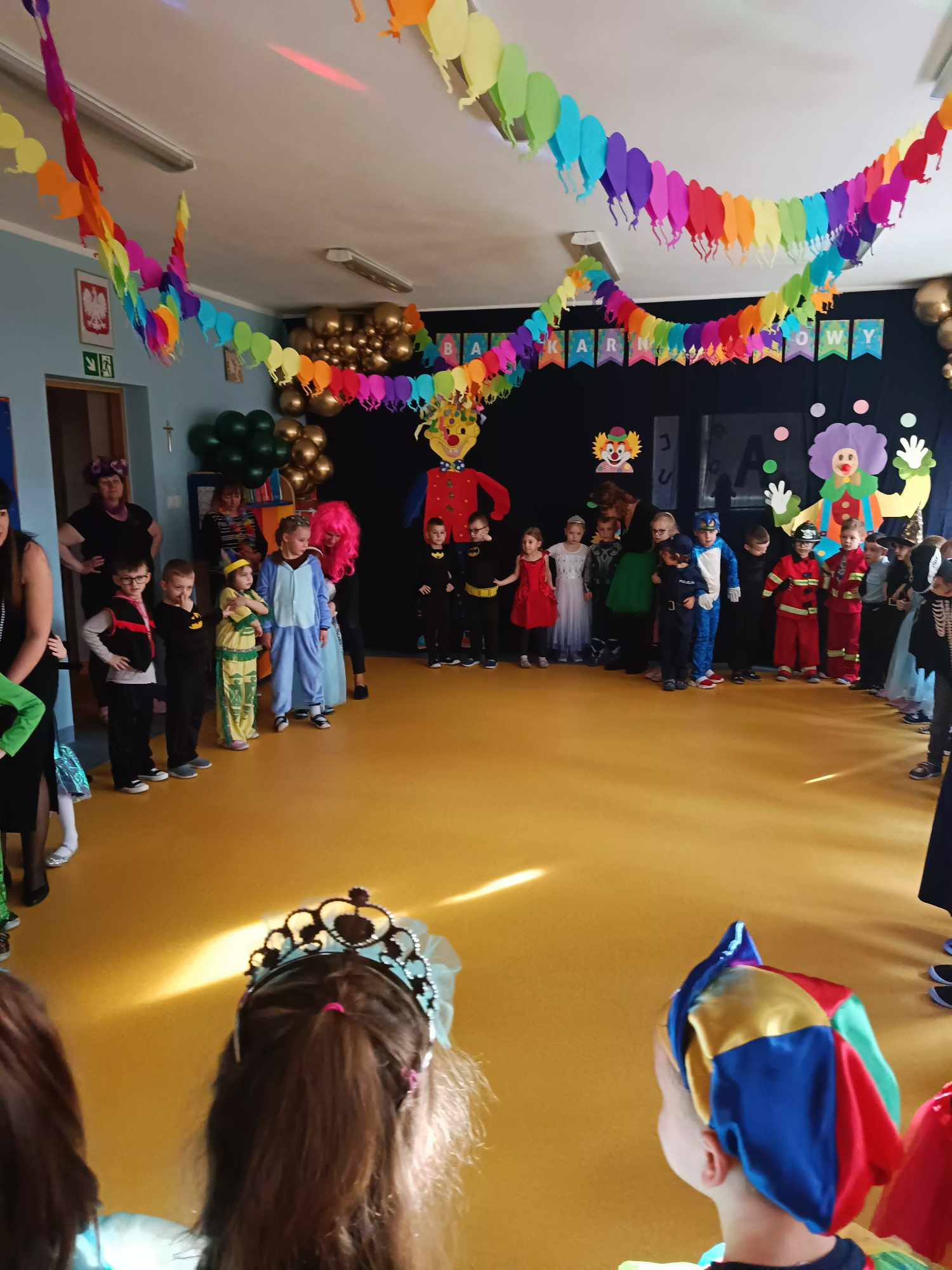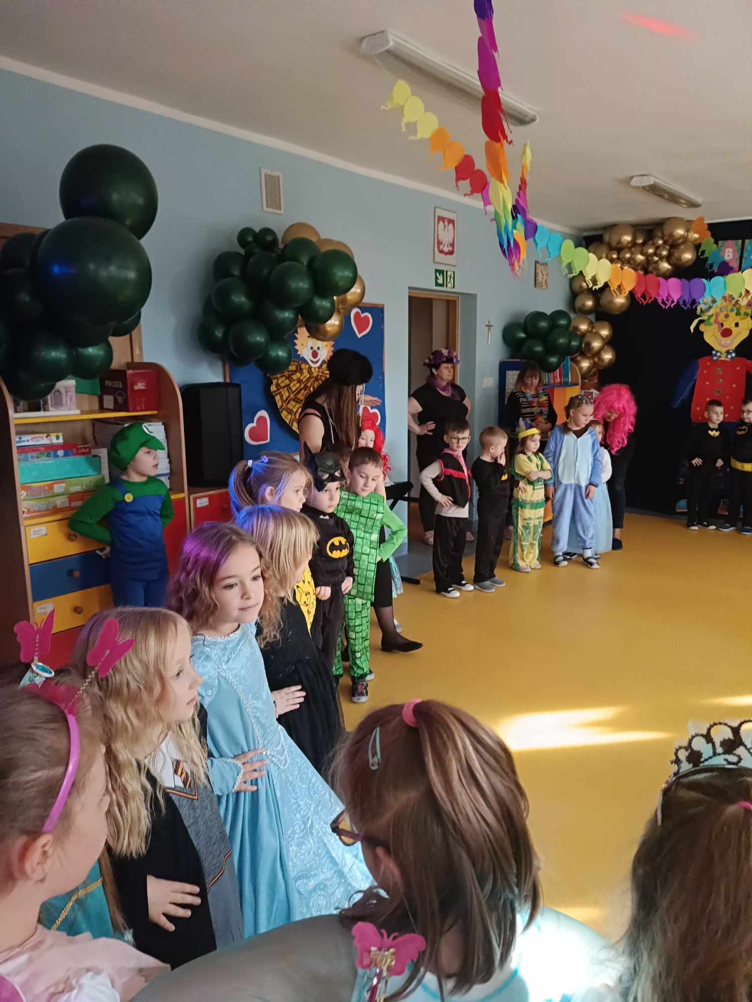 Całe wydarzenie odbyło się w radosnej atmosferze, wypełnionej tańcami, zabawami i konkursami prowadzonymi przez p. Marcina. Sala przedszkolna została pięknie udekorowana balonami, serpentynami i migoczącymi ozdobami, które wprowadzały prawdziwie karnawałowy nastrój. Wydarzenie dostarczyło dzieciom wiele uśmiechu i niezapomnianych wrażeń, a także było okazją do integracji i wspólnej zabawy.