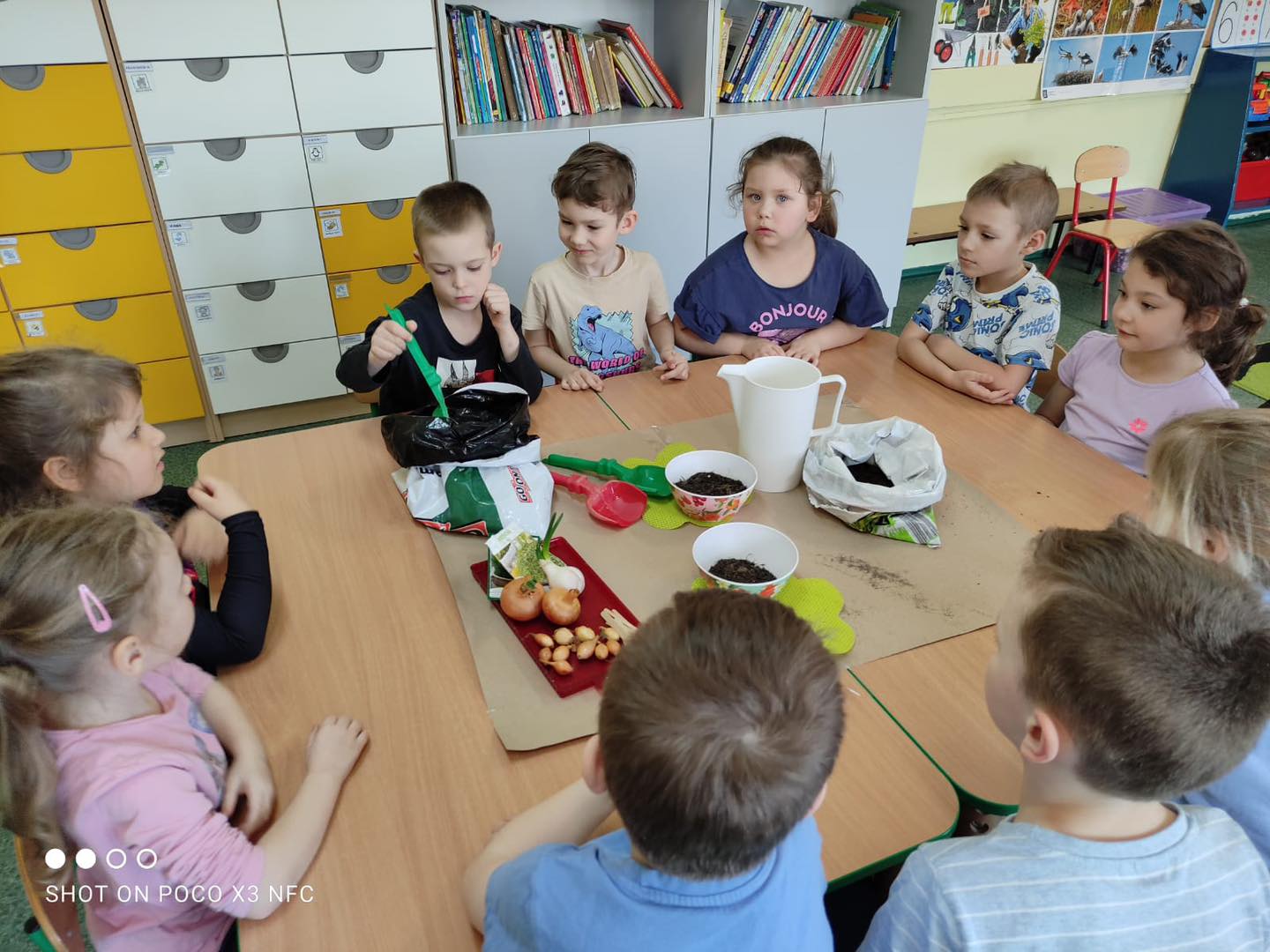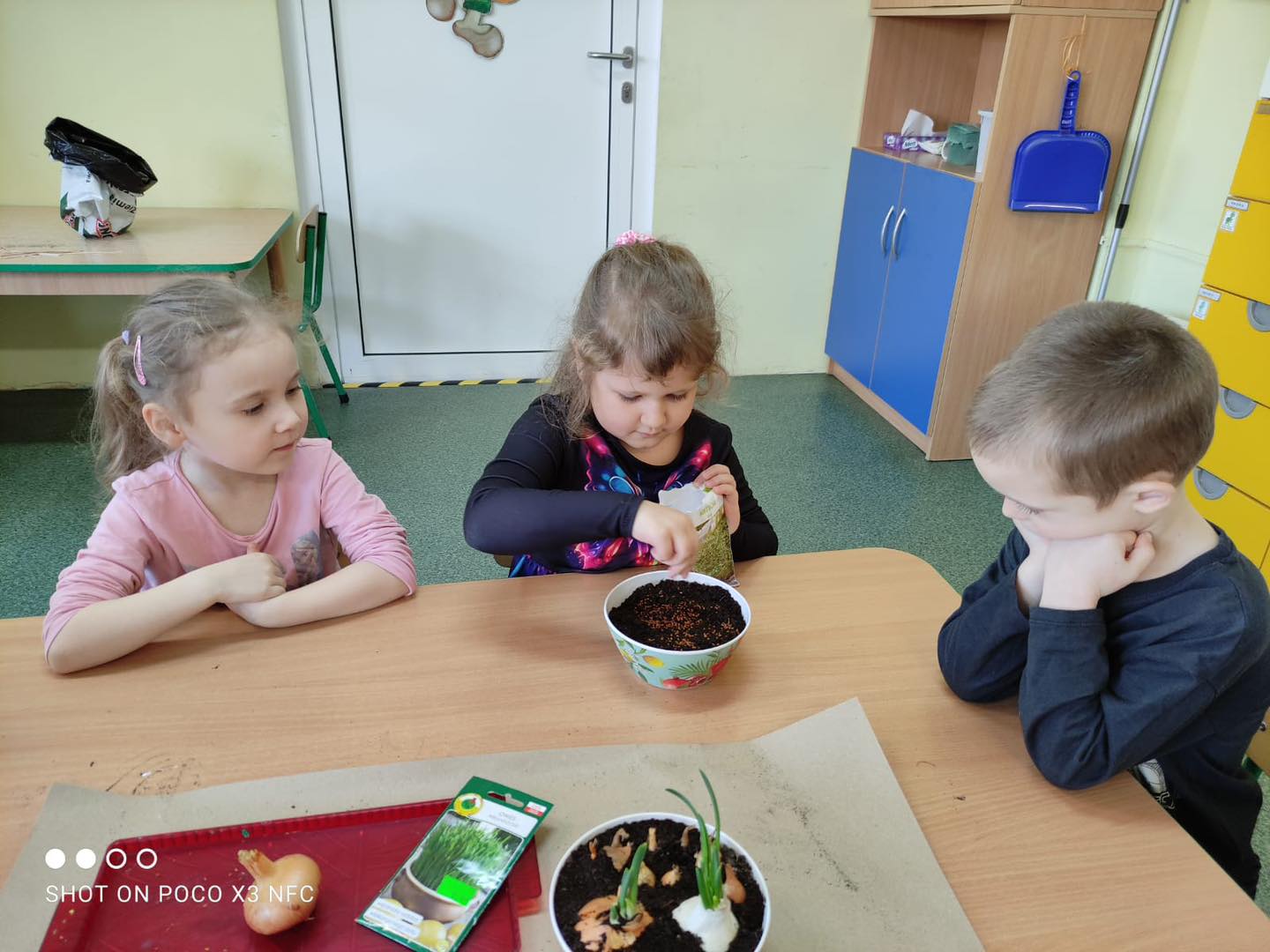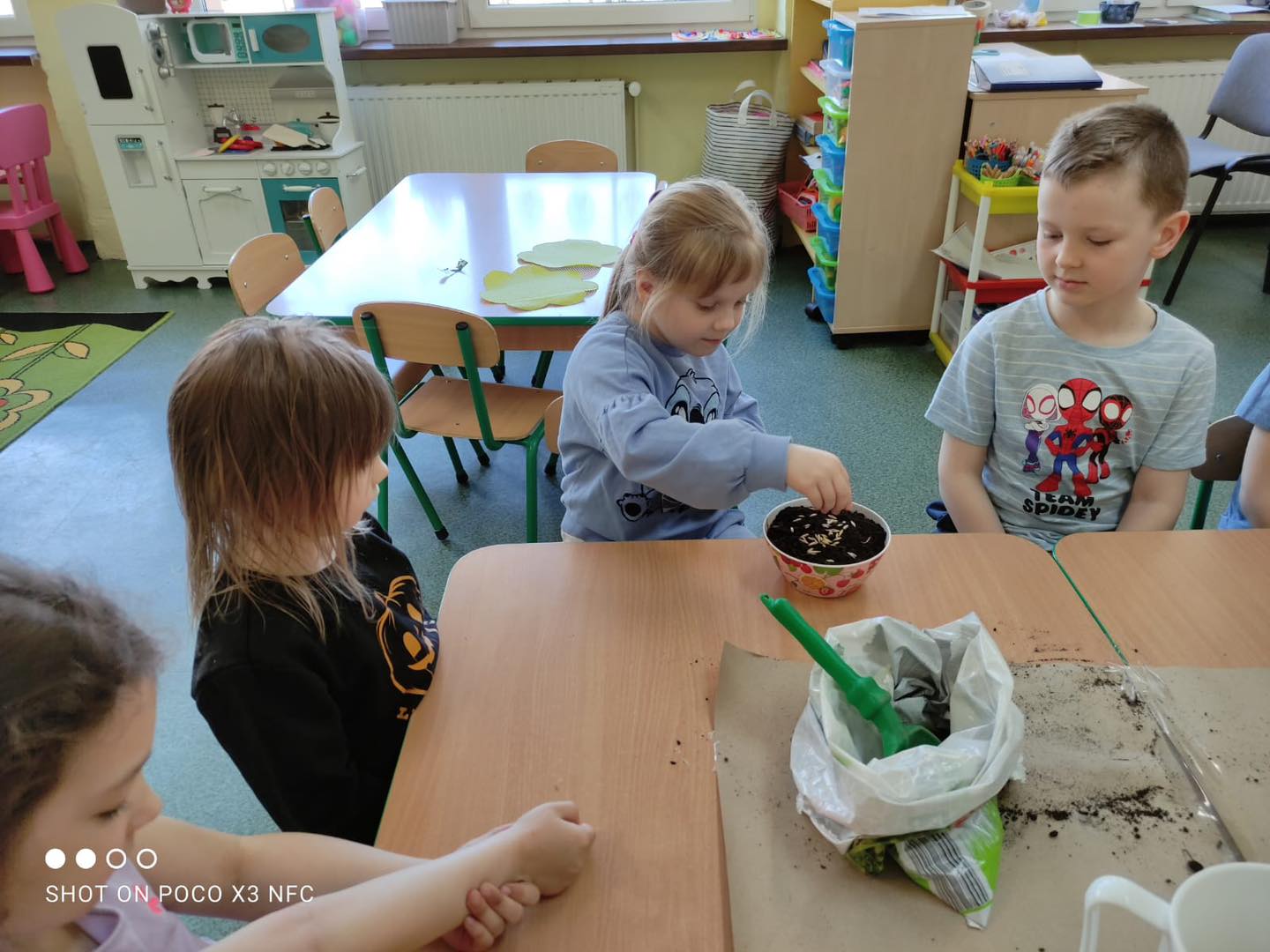 Z początkiem wiosny, dzieci 5- letnie włączyły się do utworzenia kącika zieleni w sali. To doskonałe miejsce do prowadzenia obserwacji wzrostu roślin. Teraz pozostała codzienna ich pielęgnacja.