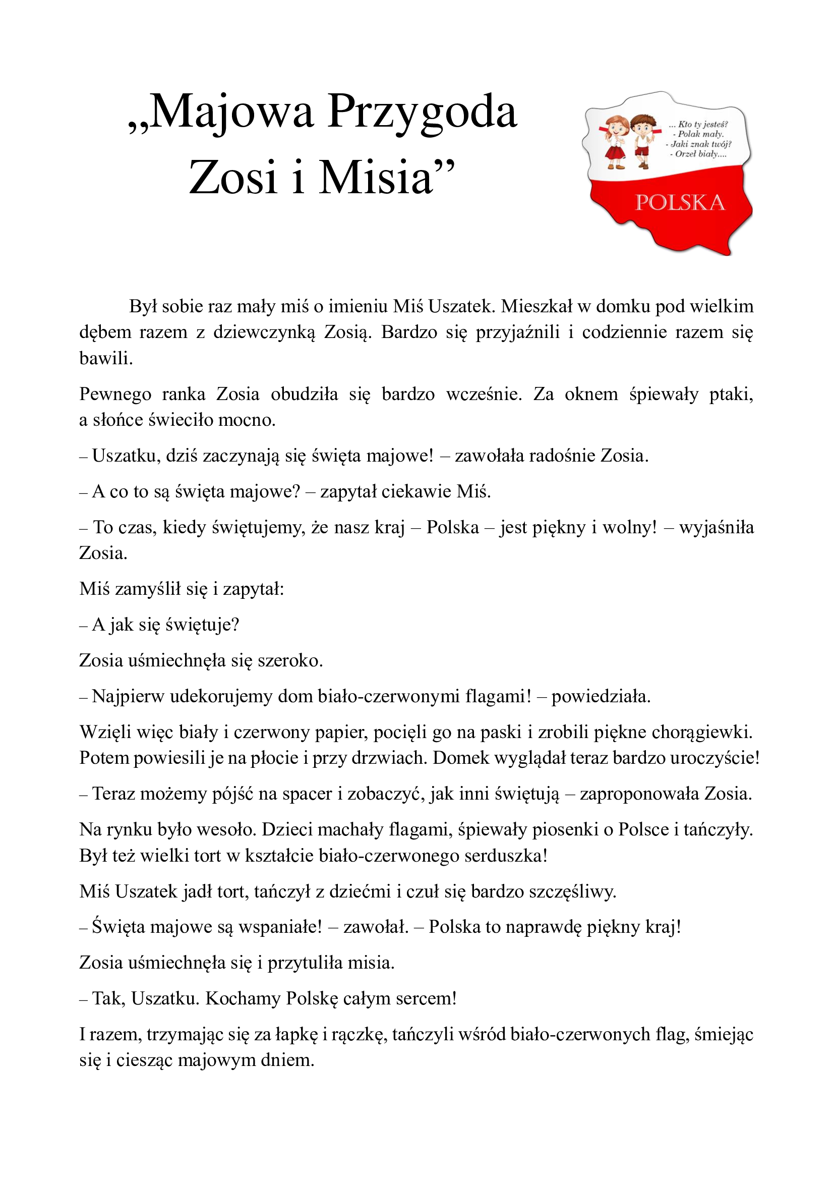 Zosia i jej wierny przyjaciel Miś uczą się, że maj to nie tylko kwitnące drzewa i śpiew ptaków, ale także czas, kiedy Polska świętuje swoją historię, wolność i jedność.W bajce dzieci wraz z bohaterami przygotowują biało-czerwone chorągiewki, uczą się piosenek i wspólnie biorą udział w radosnym, lokalnym świętowaniu. Wszystko to w atmosferze przyjaźni, ciekawości i dumy z bycia częścią czegoś większego.To opowieść, która uczy, bawi i inspiruje do rozmów o wartościach i tradycjach.