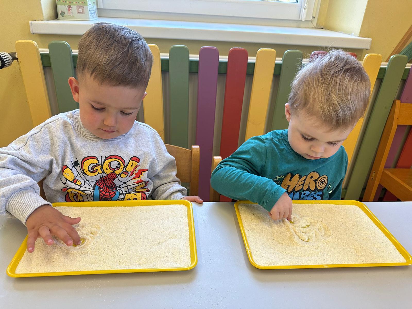 Zabawa ma na celu pobudzić zmysły dziecka, stymulować prawidłowy rozwój układu nerwowego i mózgu. Kreślenie paluszkami dowolnych rysunków usprawnia motorykę małą czyli ruch palców i dłoni.