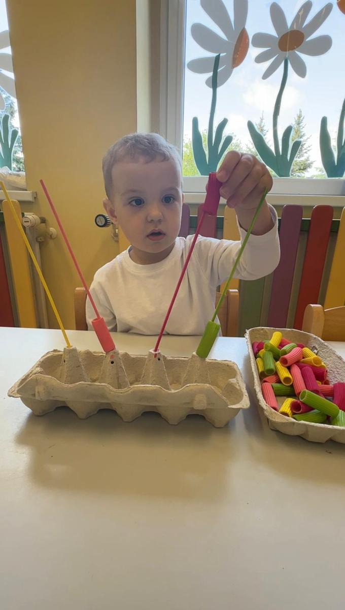 Nauka kolorów jest związana z rozwojem spostrzegania wzrokowego. Zabawa polega na nawlekania kolorowego makaronu na odpowiedni patyczek, a ma na celu ćwiczenie motoryki małej, rozwijanie logicznego myślenia, a przede wszystkim utrwalenie kolorów.