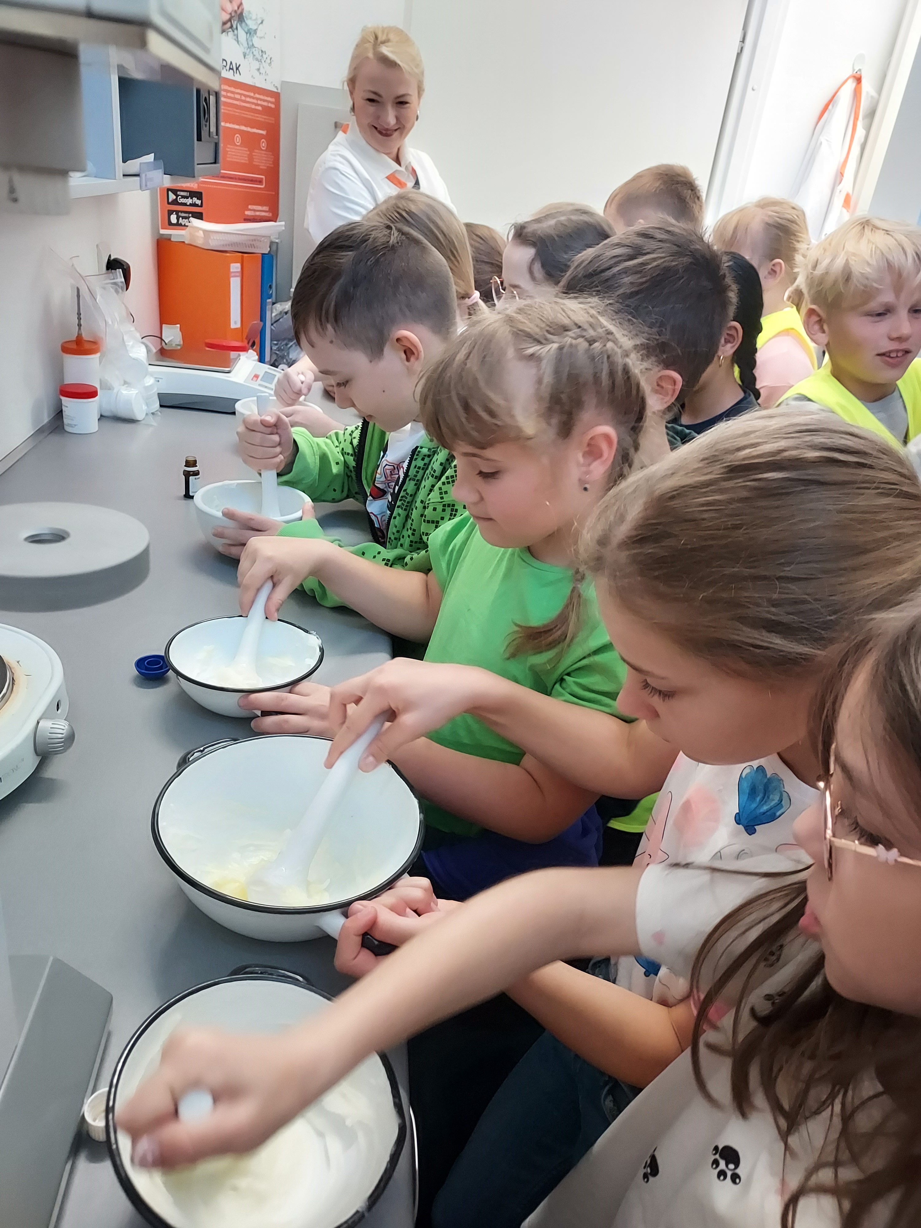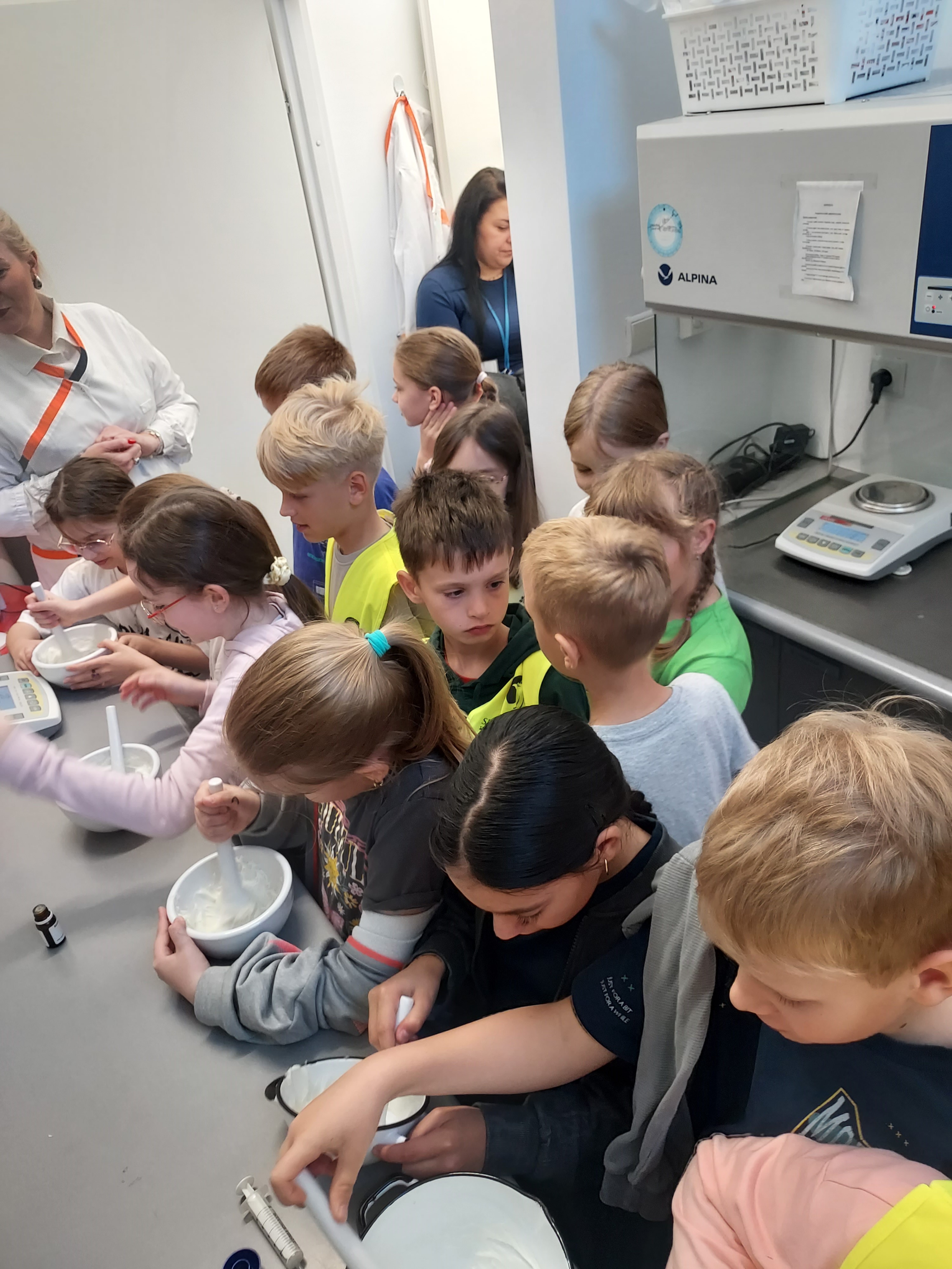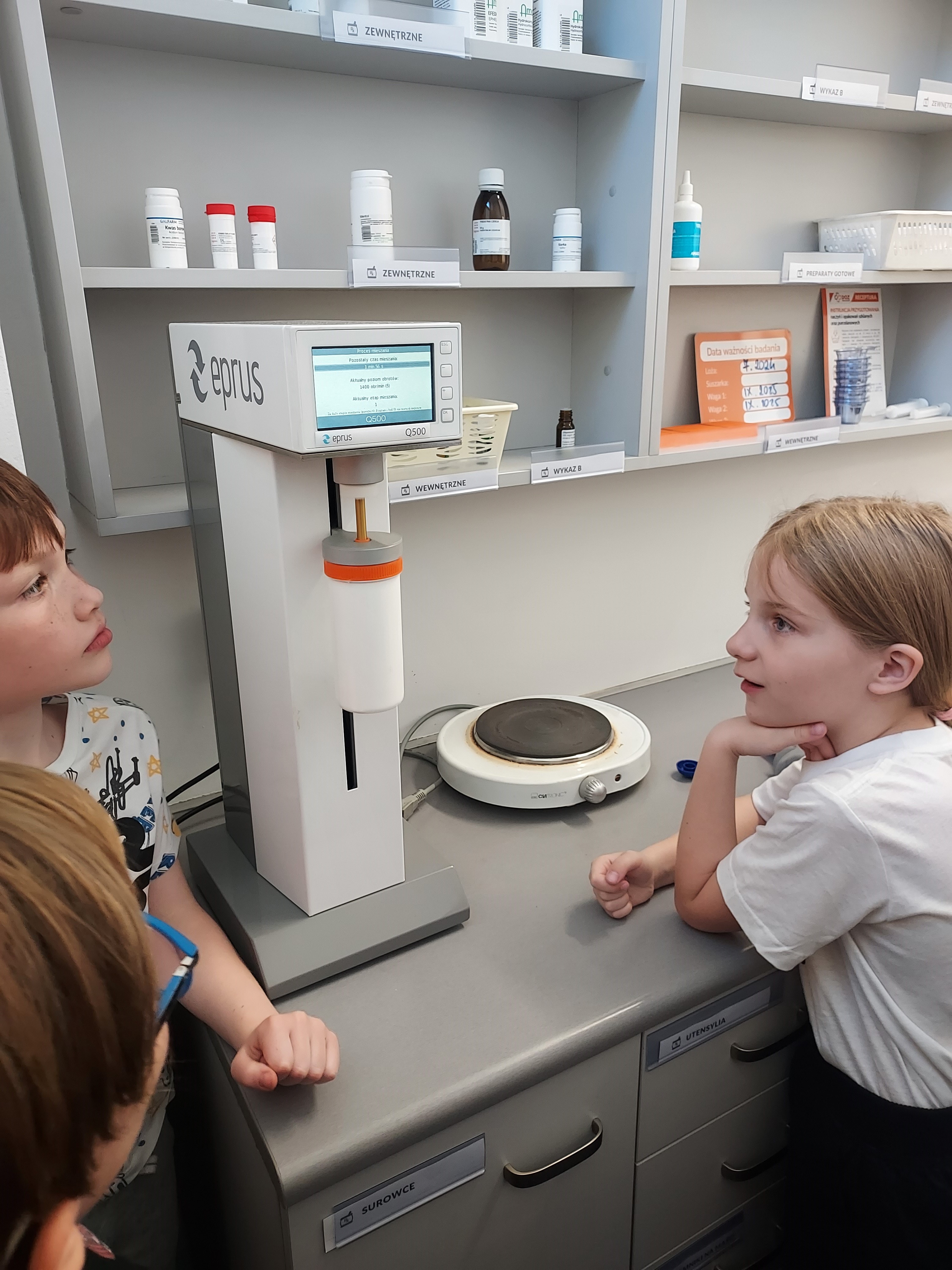 Sporą atrakcją i niespodzianką była możliwość samodzielnego przygotowania maści — oczywiście pod czujnym okiem specjalisty. To praktyczne doświadczenie wzbudziło w uczniach dużo entuzjazmu i radości, co potwierdzały szerokie uśmiechy uczestników opuszczających aptekę.