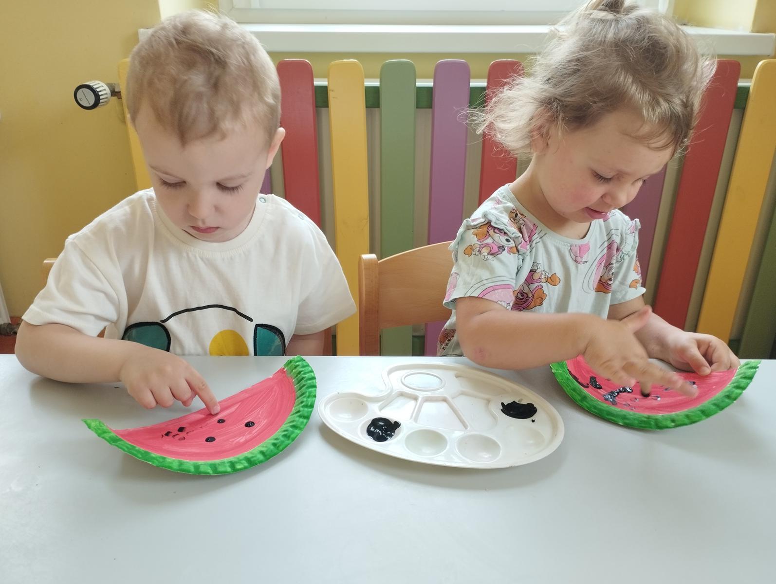 Na zajęciach plastycznych dzieci wykonywały pracę przedstawiającą kawałek arbuza. Do jej wykonania potrzebowały papierowych talerzyków i farb. Arbuzy wyszły pięknie i smacznie. Pracę można podziwiać na wystawie w szatni żłobkowej.