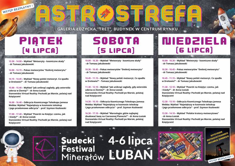 Prezentacje, wykłady, warsztaty wraz z nietuzinkową wystawą fotografii astronomicznej Michała Zimnego, rozgoszczą się w Galerii Łużyckiej (Tret). Sudecki Festiwal Minerałów tym samym wzbogaci się o nową strefę — ASTRO. Wraz ze GEOstrefą i strefą wystaw, to kolejny segment popularyzujący naukę. Tę najciekawszę — o Ziemi.