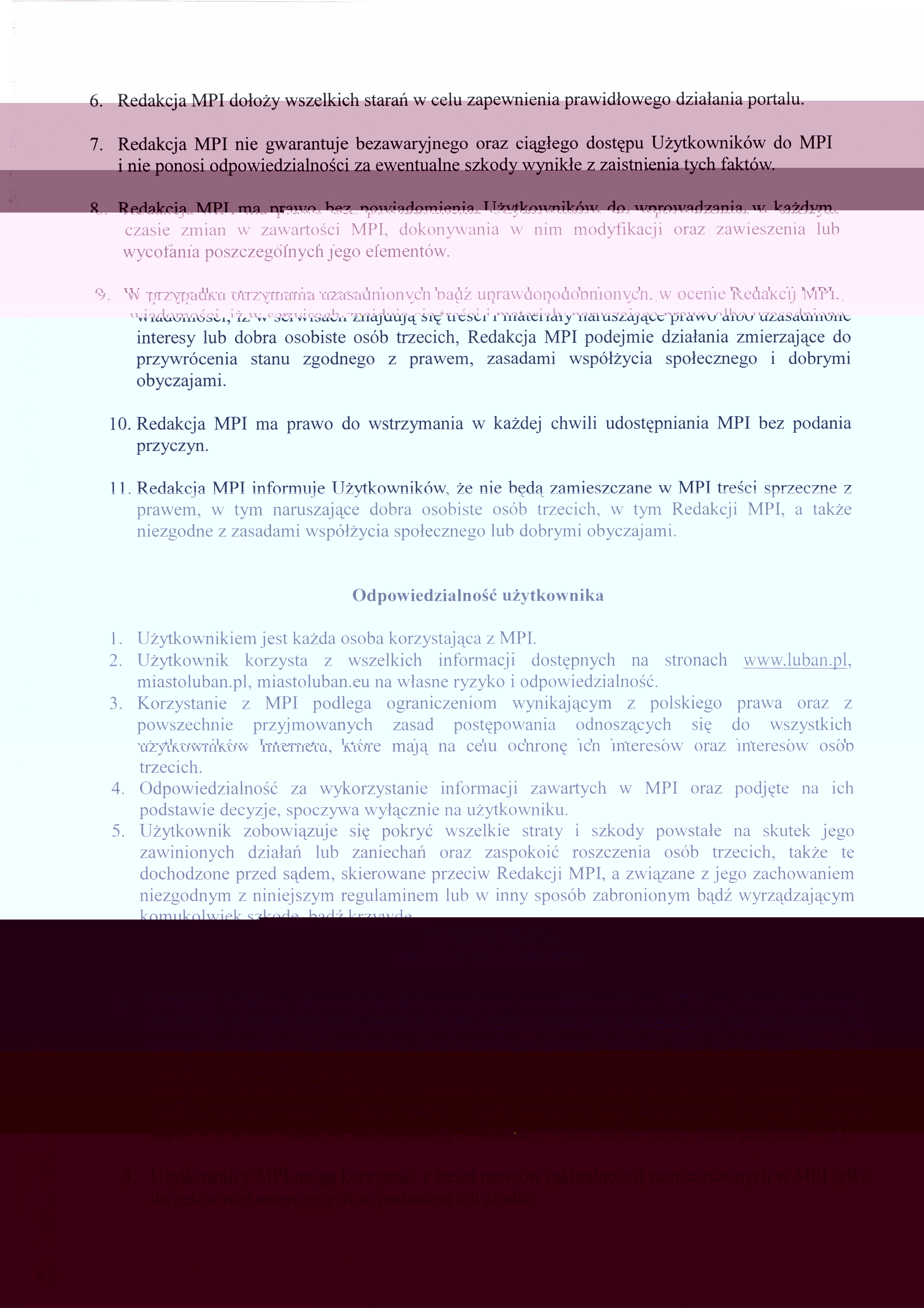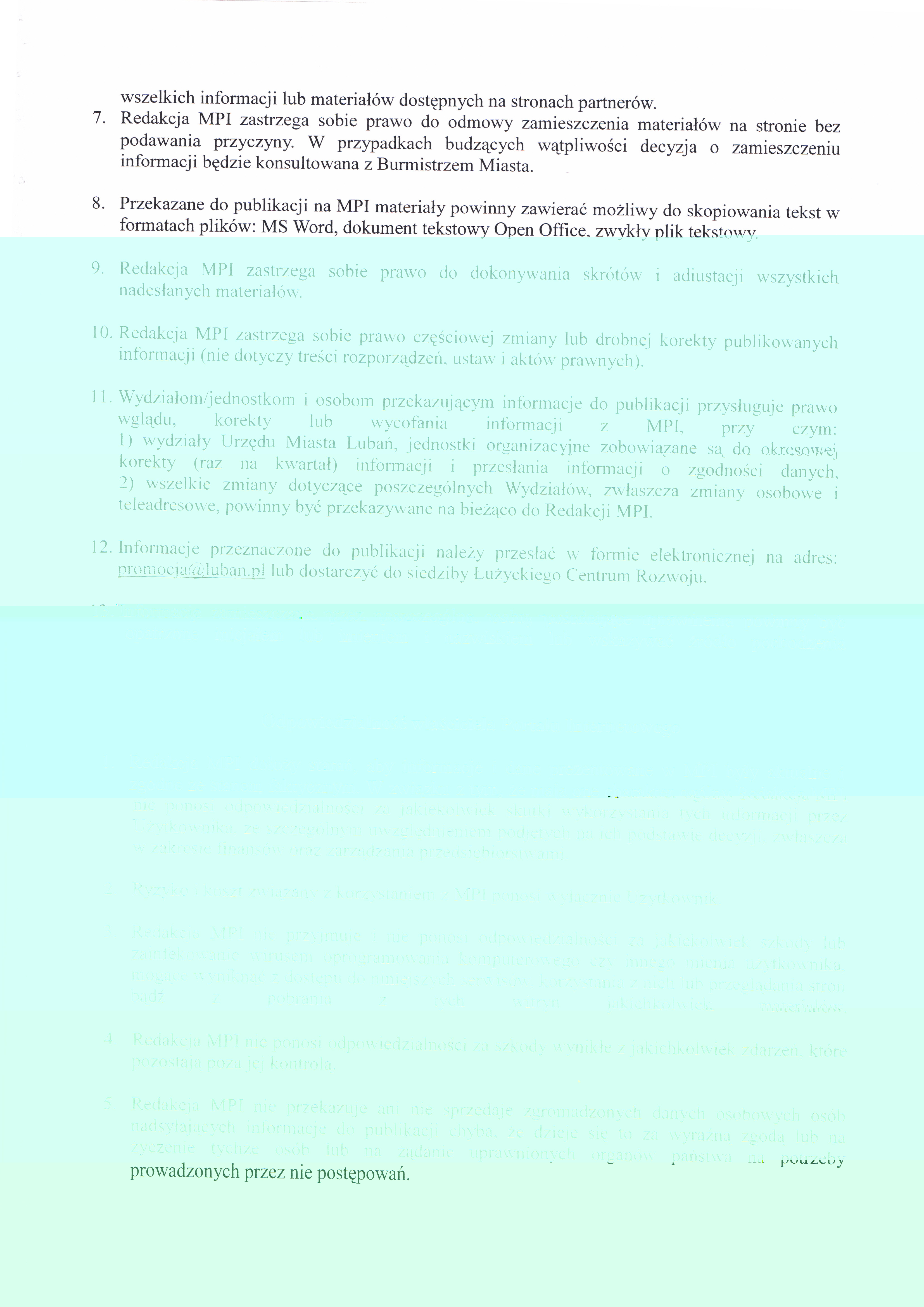 Techniczne i formalno-prawne aspekty współpracy mediów z redakcją MPI w Lubaniu porządkuje dostępny poniżej Regulamin Miejskiego Portalu Internetowego.