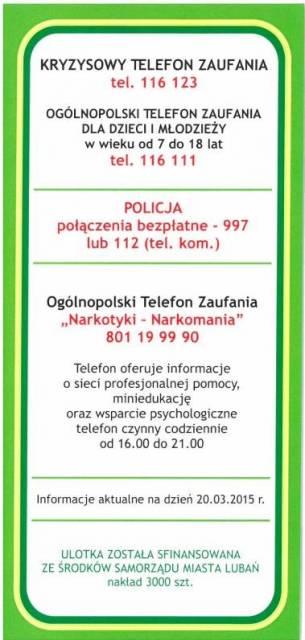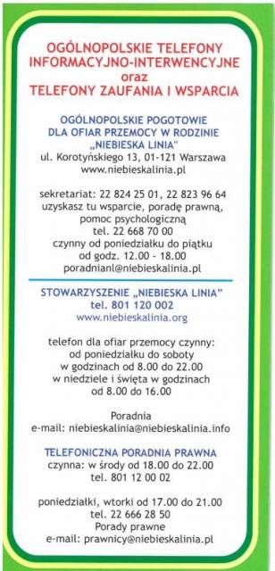 - Ogólnopolskie telefony informacyjno-interwencyjne oraz telefony zaufania i wsparcia